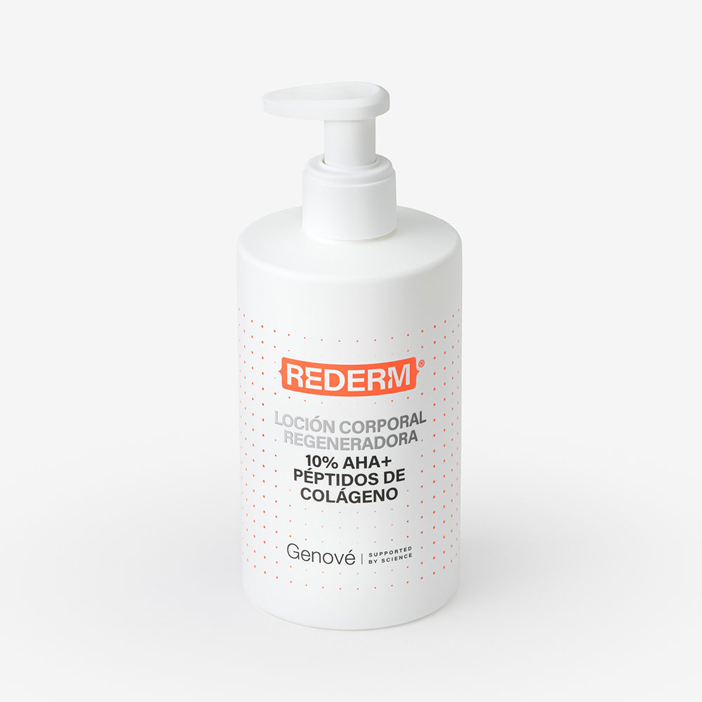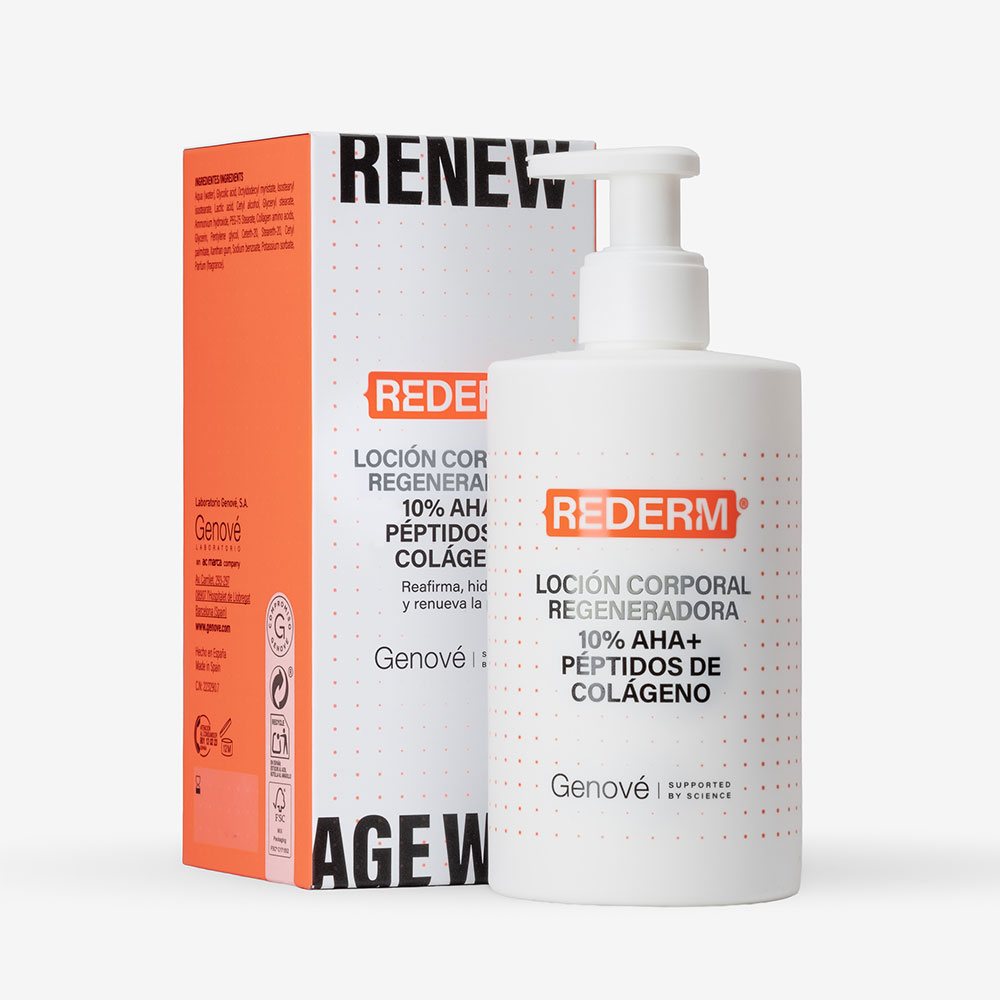 Rederm 10% + Péptidos de Colágeno es una loción corporal con AHA 10% de acción renovadora que hidrata en profundidad y renueva la piel, mejorando visiblemente la firmeza, luminosidad y textura de zonas fotoenvejecidas como cuello, escote y rodillas.